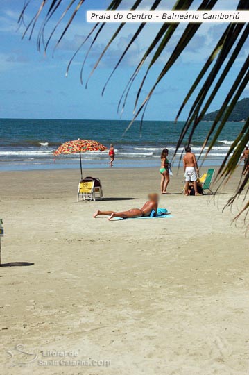 Garota tomando sol na praia central de Balneário Camboriú.