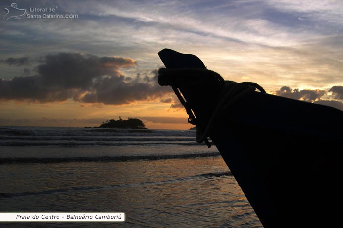 Nascer do sol na praia central de Balneário Camboriú e a ponta de um barco contracenando com a ilha das cabras.