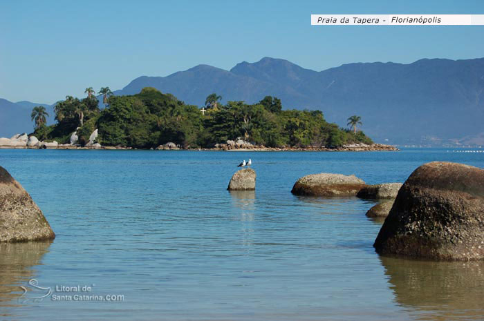praia da tapera, mar tranquilo, duas gaivotas em cima da pedra e ao fundo uma ilha linda